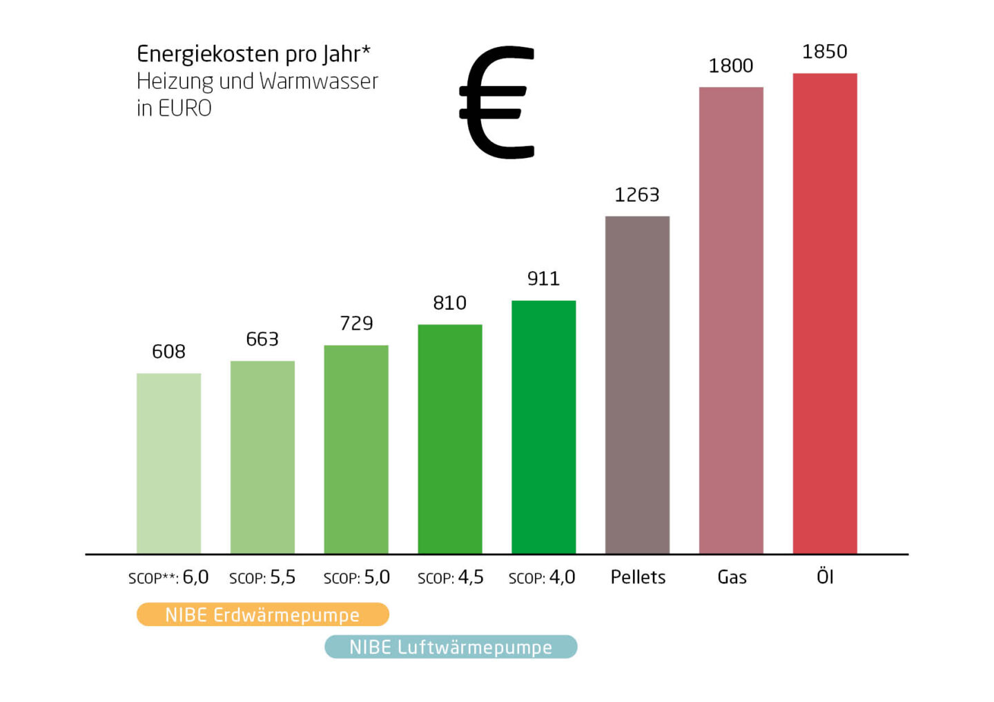 Klassische Heizsysteme stellen eine Belastung für die Umwelt sowie den eigenen Geldbeutel dar. Die Installation einer NIBE Wärmepumpe ermöglicht finanzielle Entlastung, da sich so große Summen an Heizkosten pro Jahr einsparen lassen.